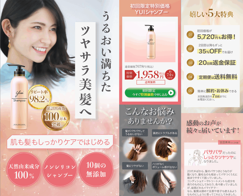 シャンプーのサンプルLPを制作しました。親しみやすさ、女性らしさのイメージを表現するために「光沢感・ピンク色」を使い、艶感や若々しさの雰囲気を意識しました。